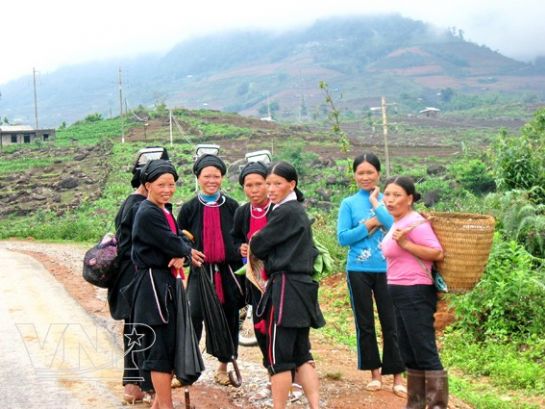 < Những người phụ nữ Dao ở đèo Lản Nhì Thàng.Đi một đoạn nữa tới đèo Lản Nhì Thàng, chúng tôi gặp một nhóm phụ nữ Dao với trang phục rất lạ mắt. Toàn bộ trang phục màu đen, điểm thêm một dải tua rua dài hồng rực trước ngực. Nhưng ấn tượng nhất phải kể đến cái mũ bằng bạc, đội trên một búi những lọn tóc dài được tết chặt như dây thừng. Người dân nơi đây rất vui vẻ và cởi mở.